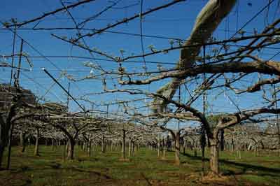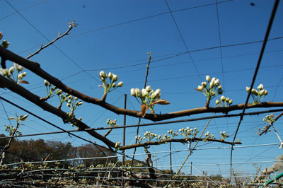写真:(左)幸水畑の様子。(右)幸水開花前の様子。